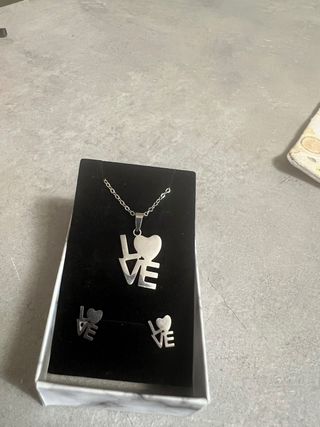 Bellissimo set coordinato composto da collana con pendente e orecchini a lobo con scritta "LOVE" e dettaglio a cuore. Perfetto come idea regalo o per un look romantico e moderno. • Design: Scritta LOVE stilizzata con cuore. • Colore: Argento. • Dimensioni: La catenina misura circa 45-50 cm totali (come visibile in foto con metro). • Condizioni: Il set è nuovo e mai indossato, tuttavia segnalo per correttezza un piccolo difetto estetico su uno dei due orecchini (un'imperfezione nella finitura del metallo sulla lettera "V", come mostrato nell'ultima foto di dettaglio). È poco visibile una volta indossato.