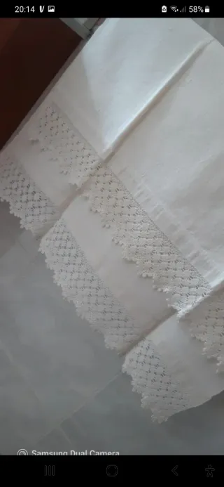 Antico asciugamano da bagno in cotone misto lino, con due bordi lavorati ad uncinetto rifiniti con un grazioso smerlo. I bordi sono alti 8 cm. Il telo misura 158x62 in totale (compresi i bordi). ** Può essere utilizzato anche come tenda oscurante oppure come originale runner per enfatizzare un tavolo.