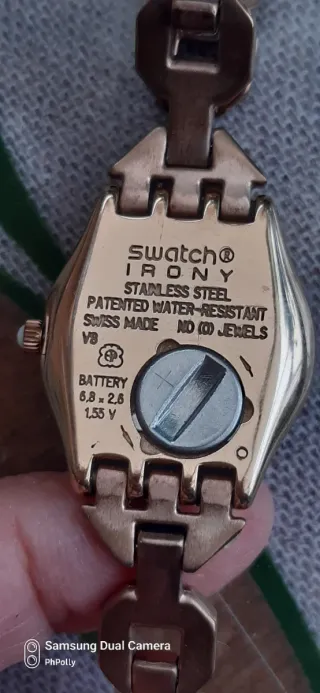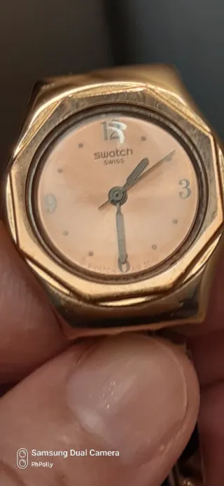 Stupendo e introvabile, ora è un oggetto "cult". Swatch "Octoshine" col.oro rosa, cassa inox ottagonale con quadrante spazzolato a raggi di sole (da cui il nome 'octo-shine'). Le maglie del bracciale hanno 6 cristalli rettangolari con un effetto geometrico elegante e prezioso. Lunghezza tot. cm 20 (ci sono maglie di riserva). Cassa mm. 25. Prezzo ufficiale 145,00! ** (Usato raramente, è in ottime condizioni, nella confezione e garanzia originale.)