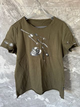 Maglietta a maniche corte per bambino, taglia 8 anni. - Colore verde militare. - Stampa grafica con posate e tazza da tè. - Orlo ondulato.