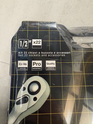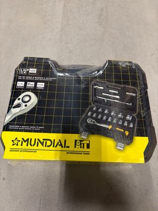 Set di 22 bussole e accessori Mundial con cricchetto reversibile a sgancio rapido 72 denti. - Cricchetto reversibile a sgancio rapido 72 denti. - Bussole in acciaio Cr-Va. - Valigetta rigida per trasporto.