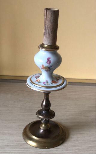 Elegante candeliere vintage con base in ottone e parte superiore in porcellana decorata. - Base in ottone. - Fusto in ottone. - Piatto decorato in porcellana con fiori. - Parte superiore in porcellana decorata con fiori. - Supporto per candela in legno. Volendo si può mettere la lampadina, facendo sistemare il filo come si vede in foto