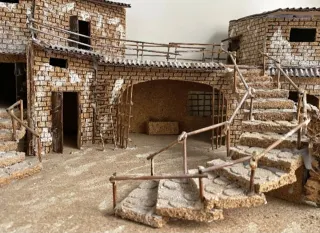 Presepe artigianale realizzato con cura in legno e sughero. - Struttura dettagliata che rievoca un borgo. - Tetti in tegole finemente lavorati. - Muri in legno. - Scale esterne in legno.