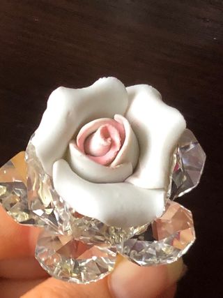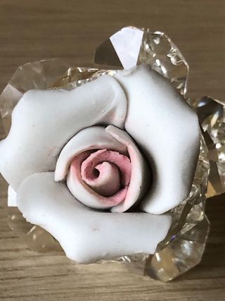 Deliziosa rosa in ceramica con dettagli in cristallo. - Fiori in ceramica bianca con sfumature rosa. - Base in cristallo sfaccettato.