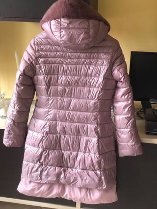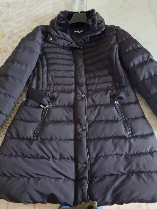 Elegante piumino lungo con cappuccio bordato in pelliccia sintetica. - Chiusura centrale con zip. - Tasche laterali con zip. - Tessuto lucido trapuntato. Ultima foto: c’è un piccolo tagliettto che si può sistemare usando la colla per tessuto
