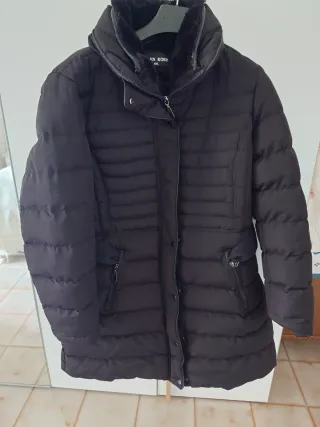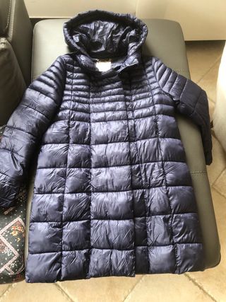 Elegante piumino blu con cappuccio, perfetto per le giornate più fredde. La sua trapuntatura lo rende un capo alla moda e funzionale. - Trapuntatura orizzontale e a quadri. - Cappuccio integrato. Lunghezza piumino 87 cm Lunghezza manica 62 cm Larghezza spalle 35 cm Da ascella ad ascella 52,5 cm
