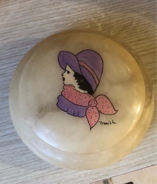 Elegante portagioie vintage con una graziosa decorazione di una donna con cappello e foulard. - Realizzato in pietra naturale. - Dipinto a mano con dettagli colorati. - Firma dell'artista visibile sul fondo.