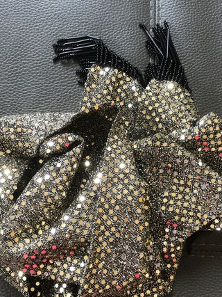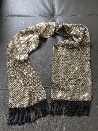 Elegante foulard con dettagli in oro e nero, arricchito da perline. - Tessuto scintillante con paillettes dorate. - Inserti decorativi con perline nere.