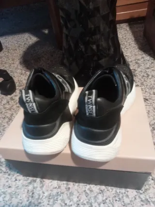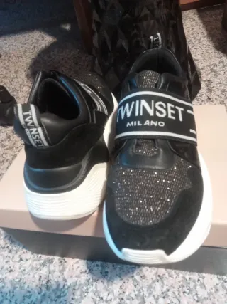 Eleganti scarpe Twinset con dettagli glitter. - Tomaia in tessuto e pelle. - Fascia elastica con logo. - Suola in gomma.