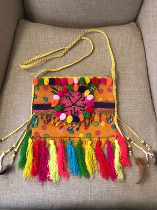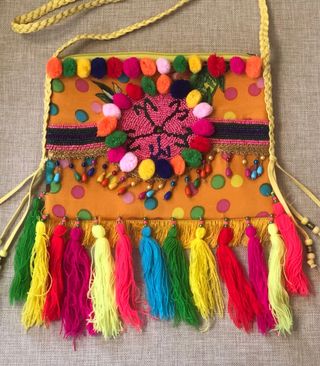 Borsa a tracolla con un design etnico e colorato, perfetta per aggiungere un tocco vivace al tuo stile. - Decorata con pompon colorati. - Dettagli con nappe e perline. - Tracolla intrecciata gialla.