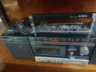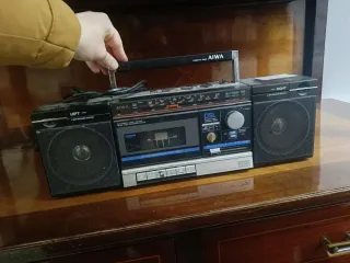 Un lettore stereo vintage AIWA con radio e lettore cassette. - Design classico in nero e argento. - Maniglia per il trasporto integrata.