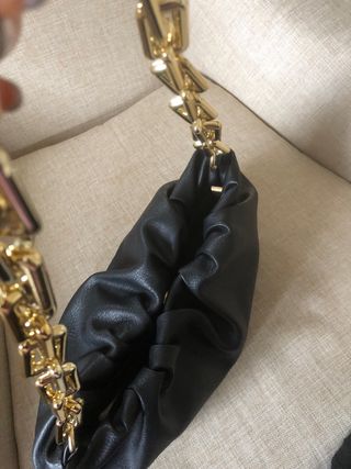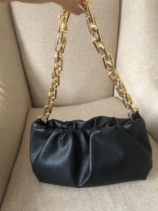 Elegante borsa nera con dettagli dorati. - Materiale similpelle. - Manico a catena color oro. - Design morbido e arricciato.