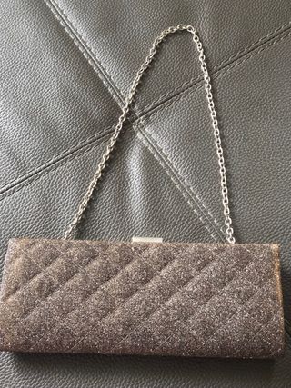 Elegante pochette con finitura glitterata e tracolla a catena. - Design trapuntato a rombi. - Chiusura a scatto. - Catena metallica color argento.