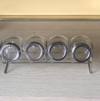 Set di quattro porta spezie in vetro con tappo in metallo. - Design moderno e funzionale. - Ideali per organizzare le tue spezie in cucina. - Facili da pulire.