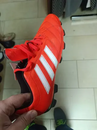 Scarpe da calcio Adidas. - Colore rosso vivace. - Dettagli bianchi sulle strisce laterali. - Taglia 37.5