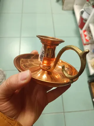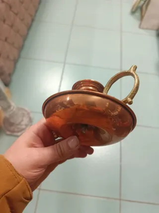 Elegante portacandele in metallo di rame, con un pratico manico dorato. - Design classico e raffinato. - Base rotonda e stabile. - Manico curvo per una facile presa.