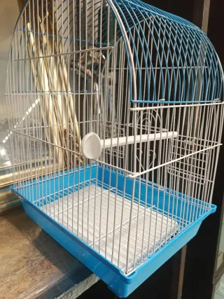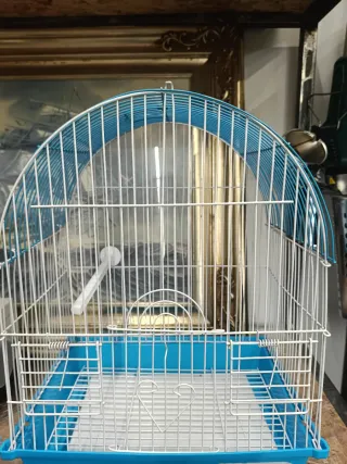Gabbia in metallo con base e tetto in plastica blu. - Struttura in filo metallico bianco. - Base e tetto in plastica blu. - Posatoio bianco incluso. - Design ad arco.