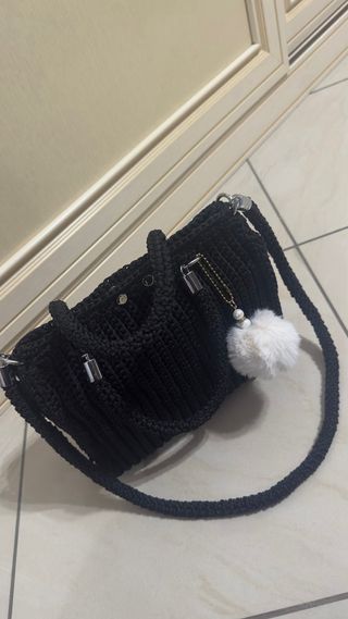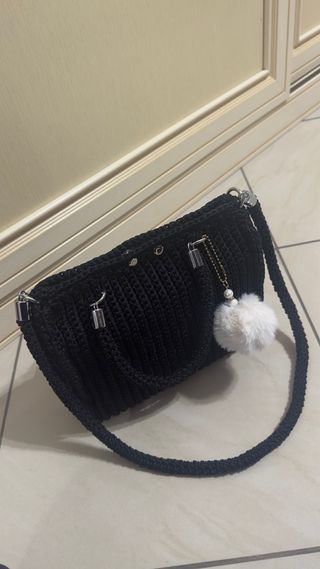 Borsa artigianale realizzata a mano, un pezzo unico. - Materiale: Filato resistente - Dettagli: Ciondolo con pompon e perla - Chiusura: Coulisse con fermi metallici - Manico e tracolla - Finiture argentate