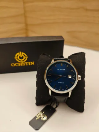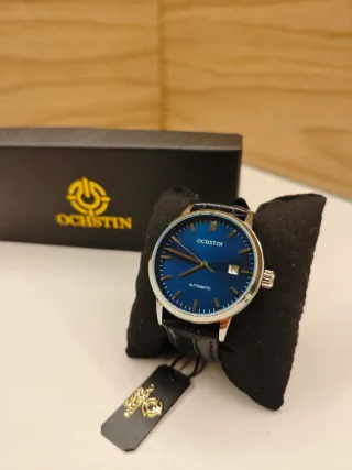 Orologio da polso Ochstin 41mm con movimento automatico con datario e hacking dei secondi,molto preciso con uno scarto di 3 secondi al giorno. Quadrante blu e cinturino blu effetto coccodrillo.