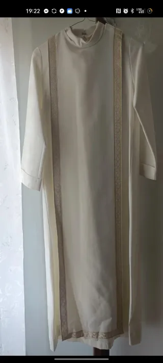Tunichetta per la prima comunione, di colore bianco. - Tessuto liscio e leggero. - Passamaneria dorata sui lati del collo e lungo la parte anteriore.