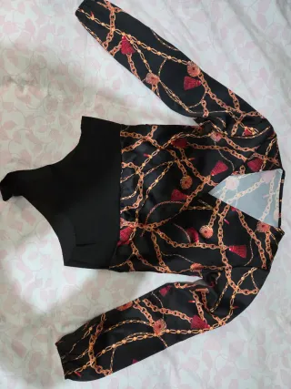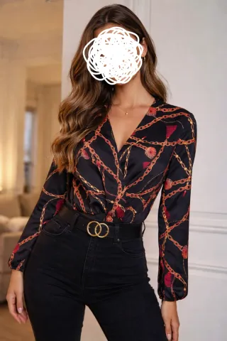 Elegante body con una stampa di catene dorate e dettagli rossi. - Scollo a V profondo. - Maniche lunghe. - Tessuto satinato. Spedizione veloce 📦