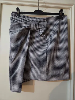 Gonna a fantasia pied de poule asimmetrica con elegante fiocco. Taglia M - Fantasia pied de poule. - Fiocco. - Asimmetrica Nuova, mai usata.