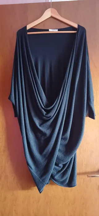 Elegante maglia con un design drappeggiato che crea un effetto cascata sul davanti. Il tessuto morbido la rende confortevole da indossare. Taglia m/l - Maniche a tre quarti. - Orlo asimmetrico.