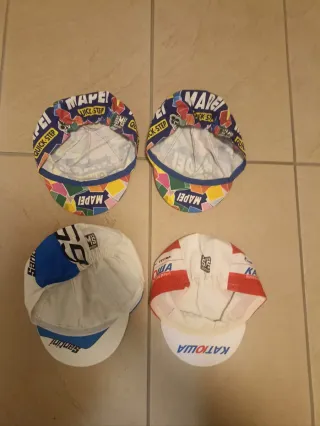 Set di 4 cappelli da ciclismo originali nuovi mai usati One size - Cappelli Mapei Quick-Step. - Cappello Santini. - Cappello Katusha. - Design colorato e sportivo. Il prezzo è cadauno, da accordare per stock di 4 pezzi