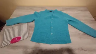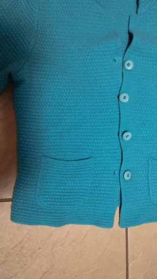 Cardigan in lana da donna, un capo versatile e caldo in ottime condizioni. Lana 80% cotone 20%. Taglia M, molto bello indossato. - Tessuto lavorato a nido d'ape. - Chiusura con bottoni. - Tasche applicate sul davanti.