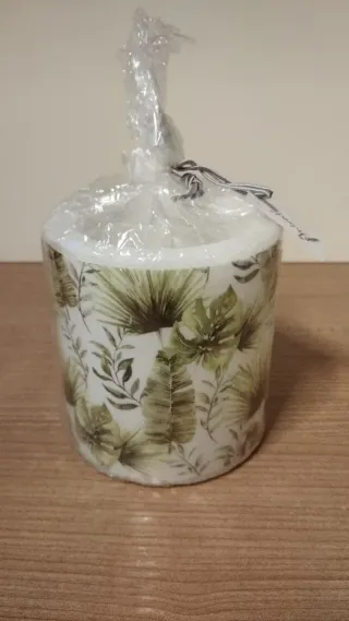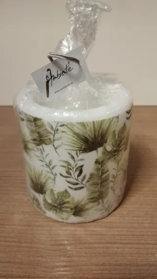 Candela decorativa con un motivo floreale tropicale by Ambiente Europe, ancora sigillata. Ottima per idea regalo. Misure cm 10 x 10.