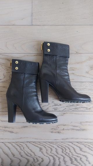 Eleganti stivaletti in pelle nera con tacco alto. - Dettagli con zip dorata sul retro. - Due bottoni dorati decorativi sul risvolto. - Suola carrarmato per un grip ottimale.