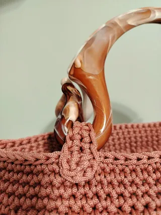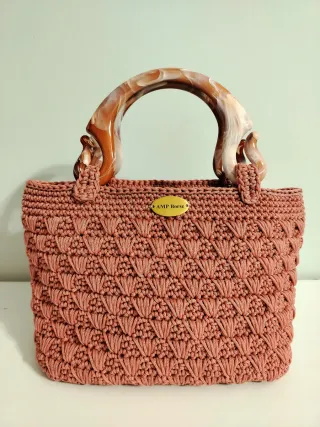 Borsa artigianale realizzata all'uncinetto in una bellissima tonalità di rosa antico. Presenta manici in resina effetto tartarugato che aggiungono un tocco di eleganza. - Motivo a rombi lavorato all'uncinetto. - Manici rigidi effetto tartarugato. - Dotata di targhetta logo