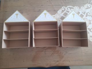 3 Scatole decorative a forma di casetta, ideale per la Prima Comunione. Presenta tre ripiani interni. - Decorazione a tema con calice e stelle. - Colore bianco e oro.