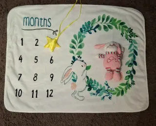 Coperta in morbido tessuto bianco, ideale per immortalare la crescita del bambino mese dopo mese. Presenta una stampa con numeri da 1 a 12 e decorazioni a tema coniglietti e ghirlanda di foglie. - Design con coniglietti e ghirlanda floreale. - Numeri da 1 a 12 per segnare i mesi. - Stella gialla decorativa inclusa.
