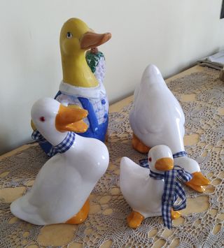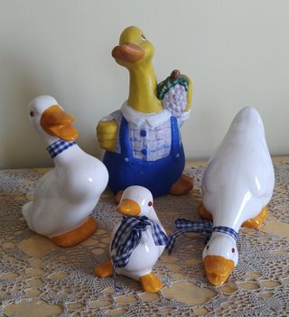 Come da titolo, vendo set di ochette di ceramica; il set è composto da 3 ochette della stessa "famiglia" + 1 simile. In ottimo stato, potrebbero dare un tocco di simpatia a molti ambienti (es. trattoria, camera bimbi, ecc.). I prezzo è chiaramente simbolico - Ochetta gialla con salopette blu e grappolo d'uva. - Ochetta bianca con fiocco a quadri blu. - Ochetta bianca più grande con fiocco a quadri blu. - Ochetta bianca con fiocco a quadri blu e collo.