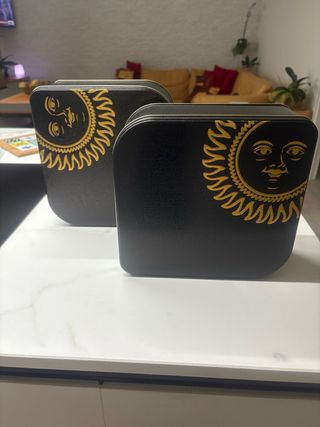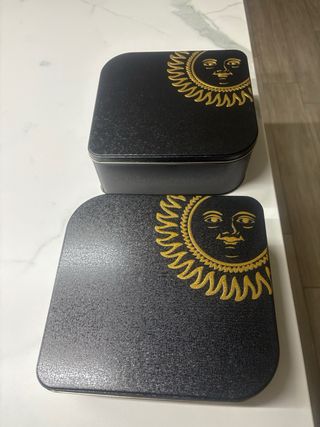 2 scatole di latta con sole dorato