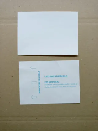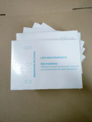 Confezione da 100 fogli adesivi formato A6, ideali per la stampa. Disponibili 50 confezioni da 100 fogli. Una confezione 4,00 euro. - Lato non stampabile indicato. - Istruzioni per la stampa incluse.