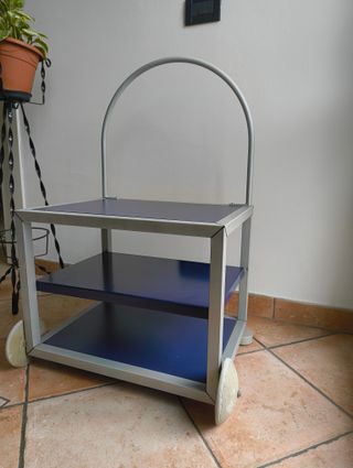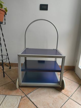 Carrellino portaoggetti vintage, design Ikea. Perfetto per organizzare diversi spazi. Altezza 80cm, larghezza 50cm, profondità 45cm - Struttura in metallo. - Ripiani in laminato blu. - Ruote per facilitare lo spostamento.