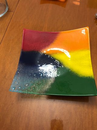 Vassoio svuota tasche in vetro di Murano, in omaggio all’acquisto, altro svuota tasche piu piccolo di colore arancione con quadrati colorati all’Interno come seconda foto