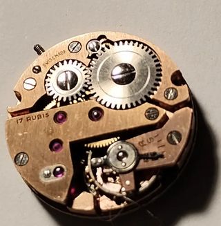 orologio meccanico a carica manuale Miramar 17 rubis, con movimento svizzero fhf 63 che nel suo, non è male, basti vedere la contropietra sull'asse dell'ancora. Diametro 19mm, ha la tidge la non la corona. spessore 4mm. Bilanciere con spirale distrutta.