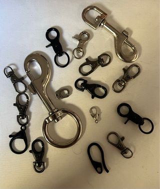 Vendo 17 moschettoni di diverse dimensioni, perfetti per vari utilizzi. Sono in buone condizioni. - Inclusi 17 moschettoni. - Materiali: metallo. - Diverse misure e finiture.