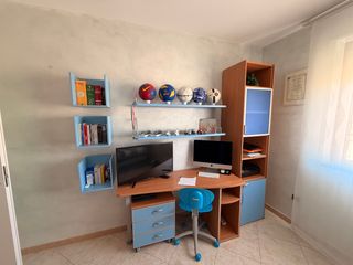 Arredo completo per cameretta composto da scrivania, libreria e sedia. - Scrivania in legno con vani a giorno. - Libreria a muro in legno con ante azzurre. - Sedia da ufficio girevole con ruote.