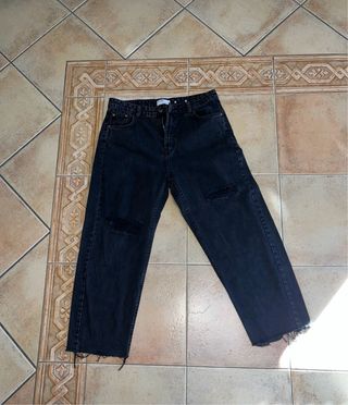 Jeans neri a vita alta con un design moderno e grintoso. - Colore nero - Vita alta - Dettagli strappati sulle ginocchia - Fondo sfrangiato -Taglia EU 42