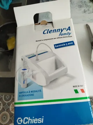 Nebulizzatore Clenny A Family di Chiesi, ideale per l'uso domestico. Completo di ampolla con 2 modalità di erogazione. - Aerosol a compressore. - Garanzia 5 anni. - Made in Italy.
