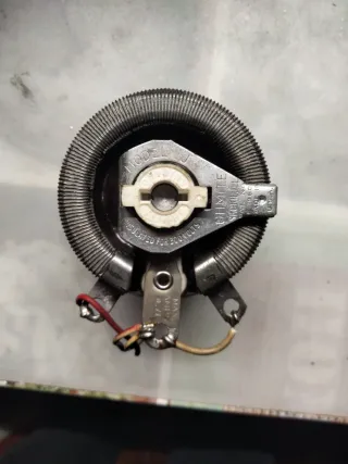 Trasformatore Variac per la regolazione della tensione. - Avvolgimento in rame. - Manopola di regolazione. - Base circolare.