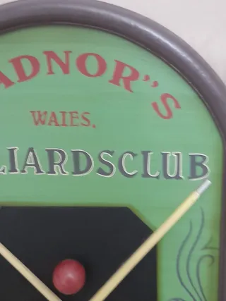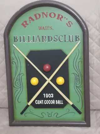 Quadro decorativo a tema biliardo Radnor's Billiards Club. - Scritta Radnor's Waies. Billiards Club. - Anno 1903. - Dicitura Cent Cocor Ball. - Decorazioni con stecche da biliardo e palline.
