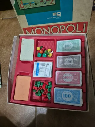 Gioco da tavolo Monopoly, edizione italiana. La scatola presenta danni come da foto, ma il contenuto è completo. - Include denaro Monopoly. - Pedine colorate. - Carte proprietà e dadi.