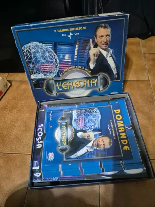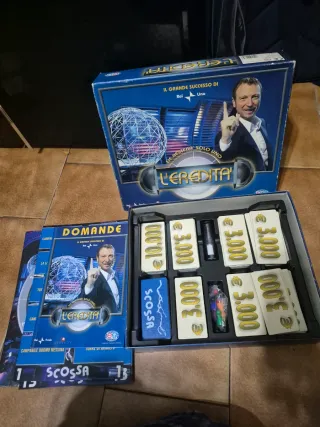 Gioco da tavolo L'eredità, basato sul famoso programma televisivo. Le condizioni generali sono buone. - Include carte domande. - Carte denaro con tagli da €10.000 e €3.000. - Carte Scossa.