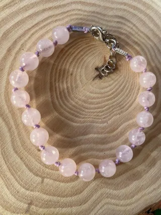Elegante bracciale realizzato a mano con pietre di quarzo rosa. - Chiusura a moschettone in metallo, regolabile ( da 21 cm a 25 cm) - Pietre naturali di quarzo rosa. Il quarzo rosa è associato al chakra del cuore (4°), e viene infatti chiamato la pietra dell'amore, oltre che verso gli altri anche verso sé stessi. Aumenta l'autostima, e migliore la rabbia e la tensione portando pace e armonia. A livello fisico agisce sulle infiammazioni, e può dare beneficio in presenza di disturbi del sonno.