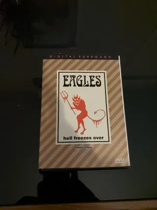 DVD degli Eagles Hell Freezes Over. - Copertina con design a righe. - Immagine del diavolo rosso con tridente. - Testo hell freezes over in basso.